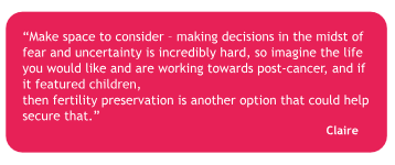 • Have the chance to discuss the impact of cancer and its treatment on future fertility with their treatment team at the time of diagnosis