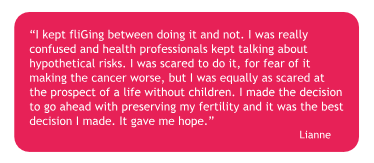 it comes at a time when you were planning to start a family or before you have completed your family. It may change how you feel about yourself and you may feel intense grief at the loss your cancer has caused.